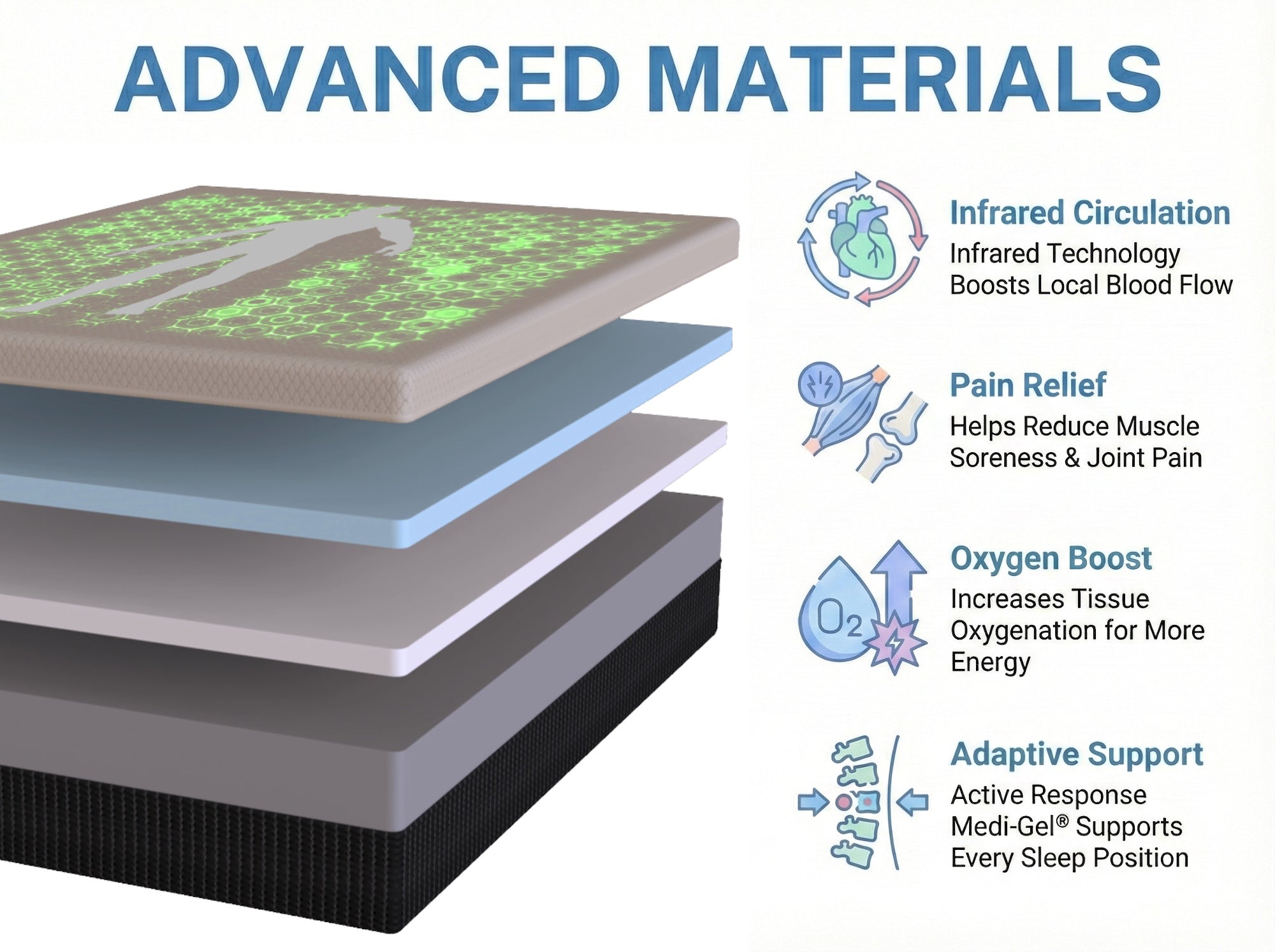 NanoSleep™ starts with CELLIANT® technology, a state-of-the-art textile that absorbs body heat and converts it into infrared (IR) energy. This energy enhances local blood circulation, temporarily relieving muscle soreness and joint pain. CELLIANT® also boosts tissue oxygenation, which promotes faster recovery and better performance. The mattress's top layer features Active Response Medi-Gel®, which adjusts to your sleeping position to support your spine, providing a cooler, hypoallergenic surface for restful sleep. Beneath this, the High-Density Low Compression Medi-Foam® layer minimizes motion transfer and enhances overall support. The base layer, crafted with Medi-Foam®, ensures durability and weight-bearing support for all sleep styles.