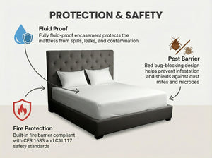 • Fluid proof, machine washable, bed bug block and fire barrier
