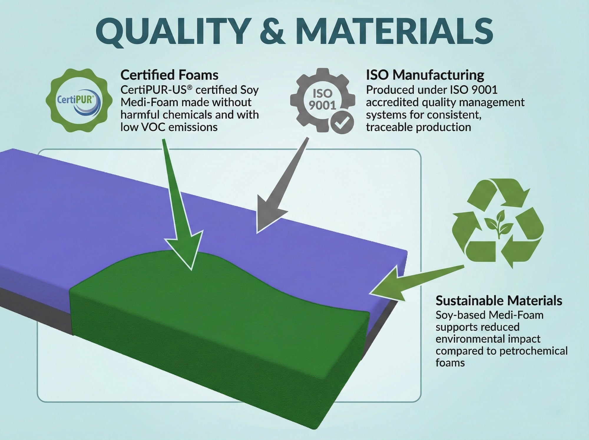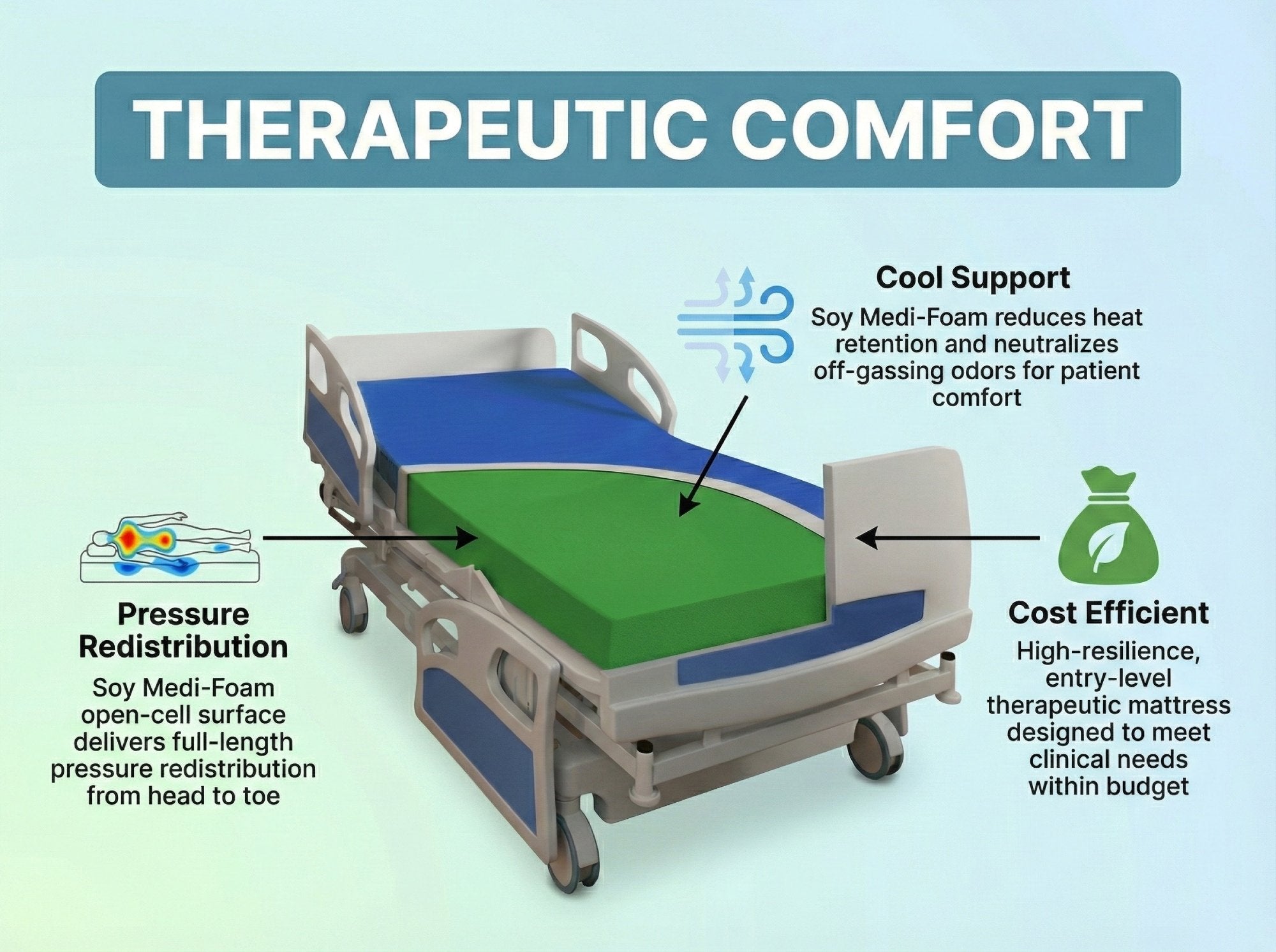 • Full top layer of Soy Visco or Soy Hybrid Gel on all pressure redistribution therapeutic surfaces.