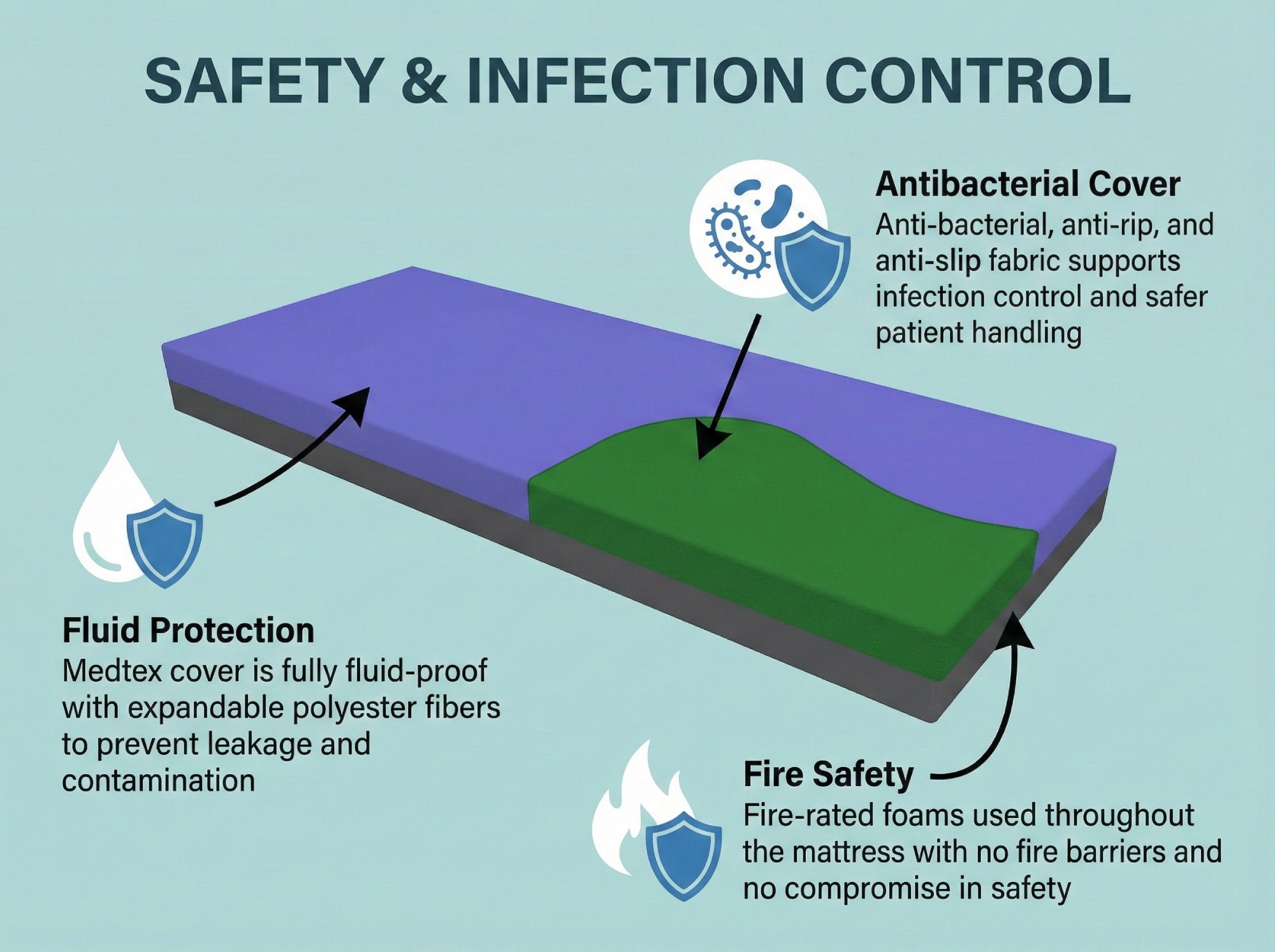 • Medtex cover: anti-rip fabric with anti-slip technology for comfort during bed articulation and Nursing Staff assistance.